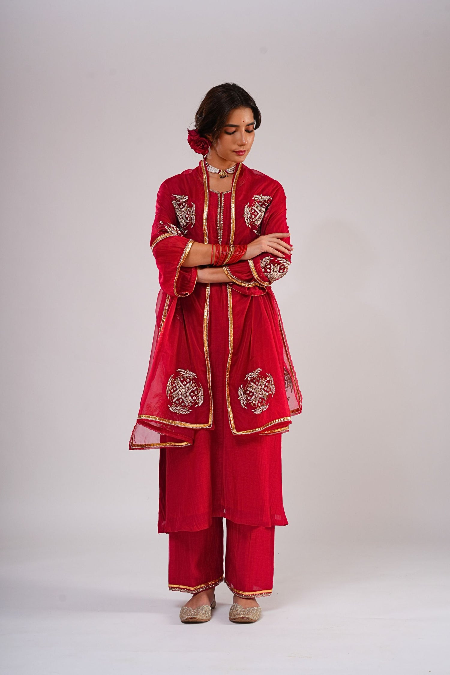 Maroon Silk Chanderi A-Line Hand Embroidered Kurta Set