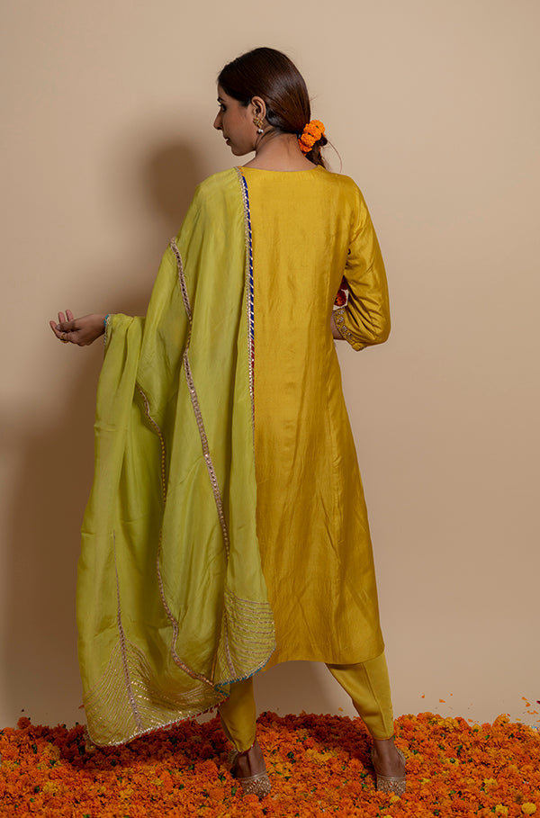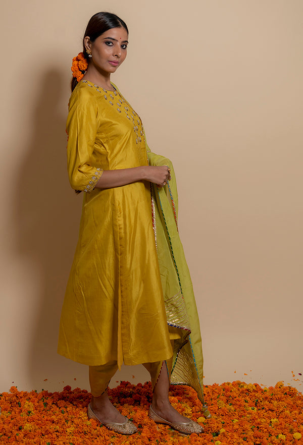 Yellow Silk Embroidered Gota Round Neck Kurta Set