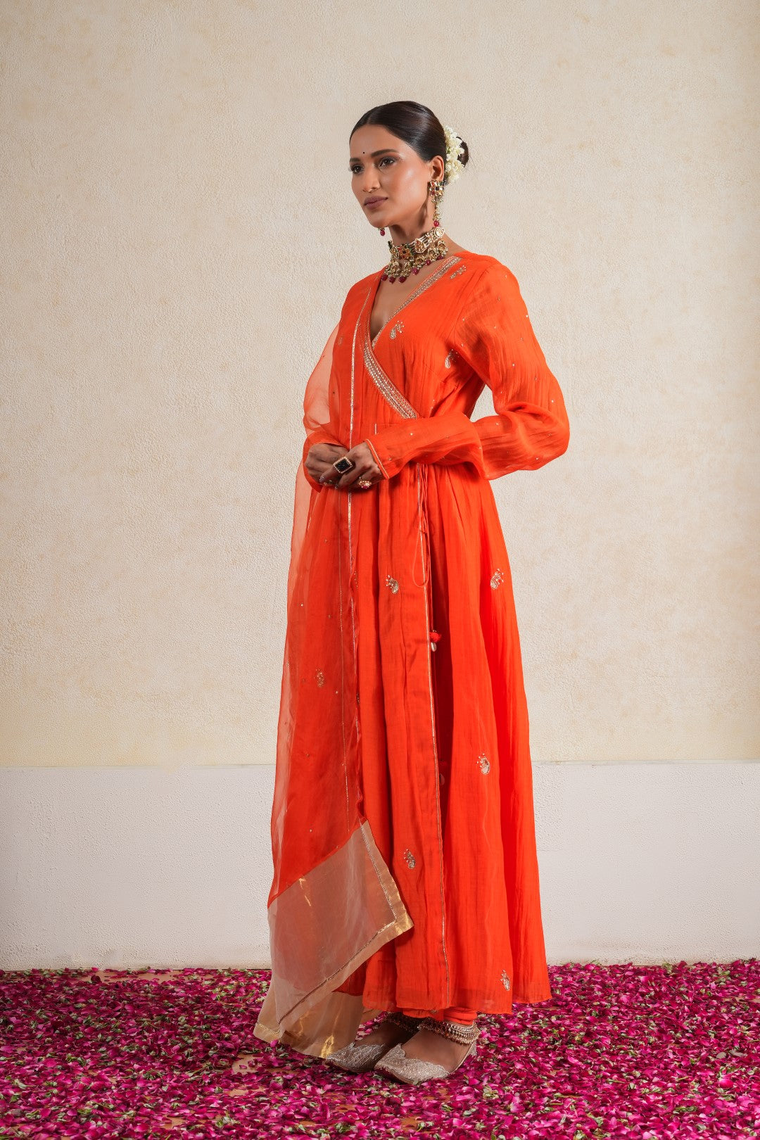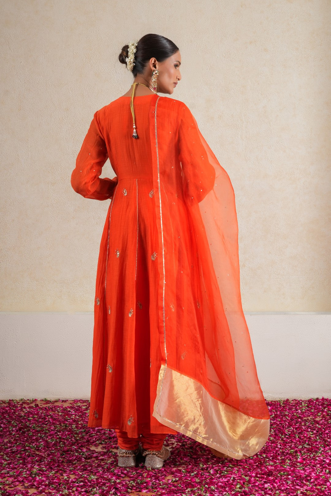 Genda Orange Pure Silk Chanderi Hand Embroidered Anarkali Set