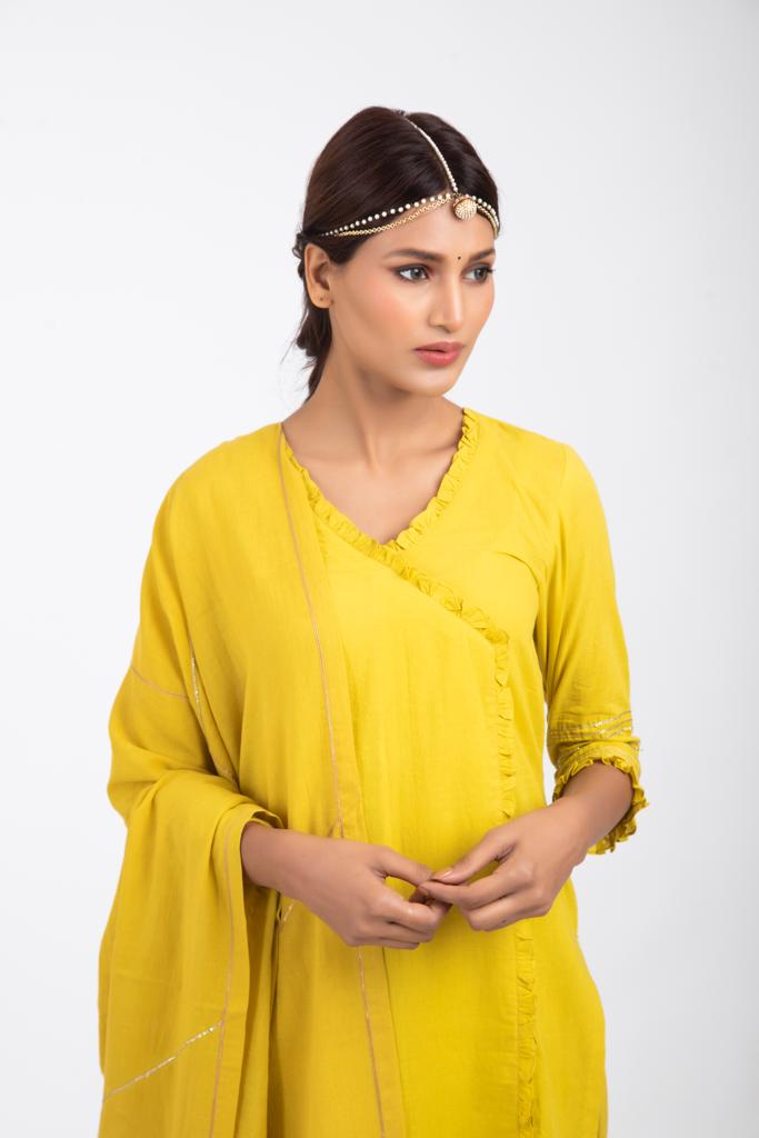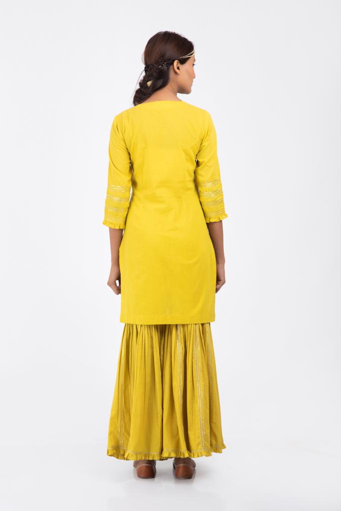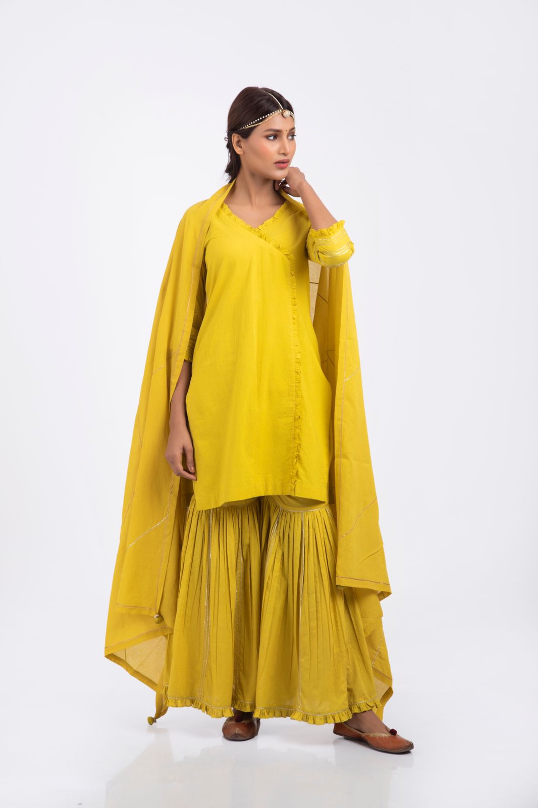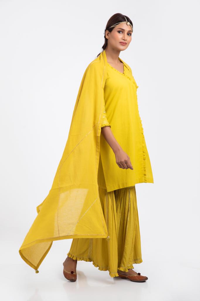 Description: Angrakha frill kurta paired with cotton gharara with gota on it