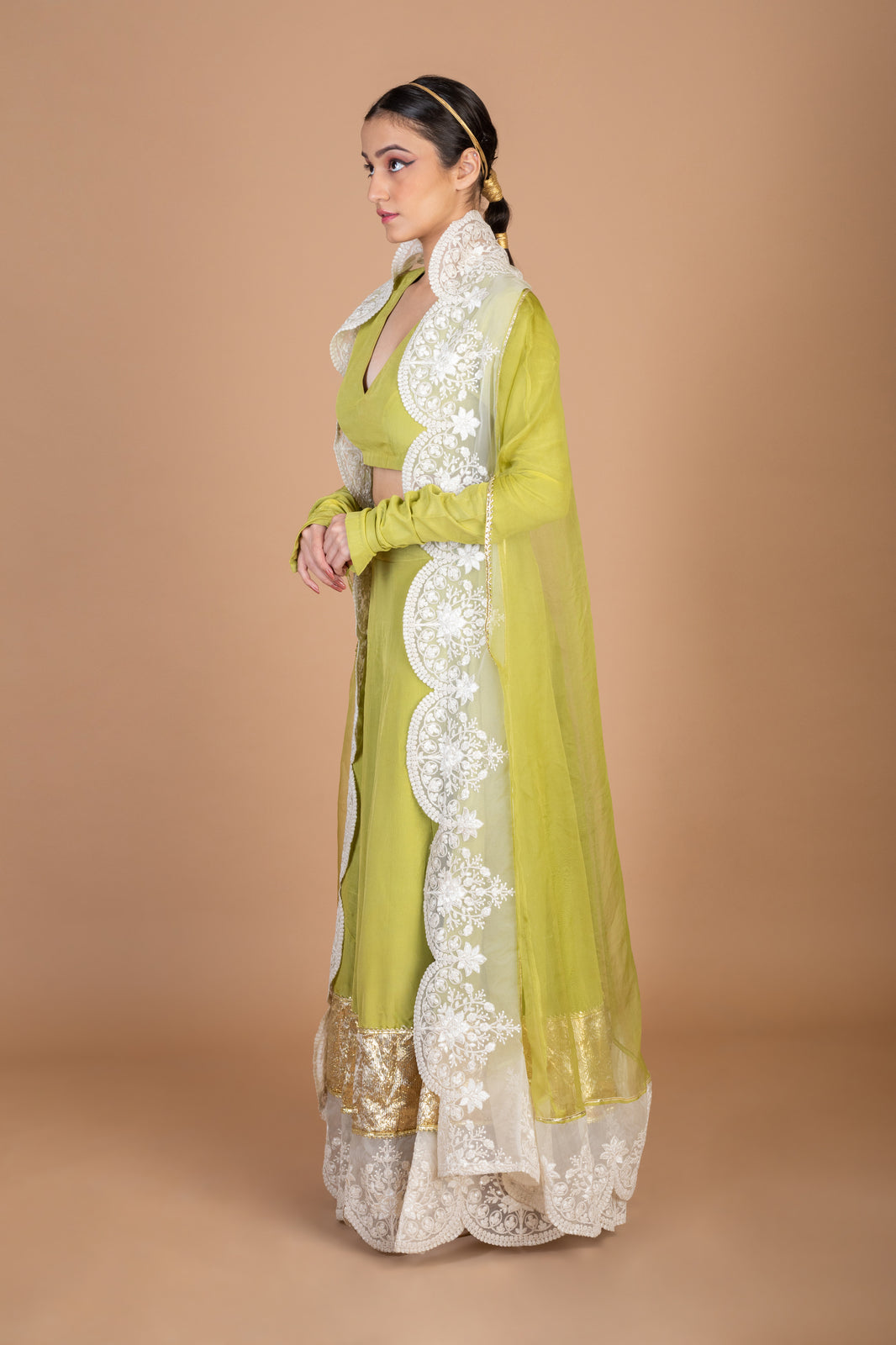 Pear Green Organza Scalloped Embroidered Cape Lehenga Skirt Set
