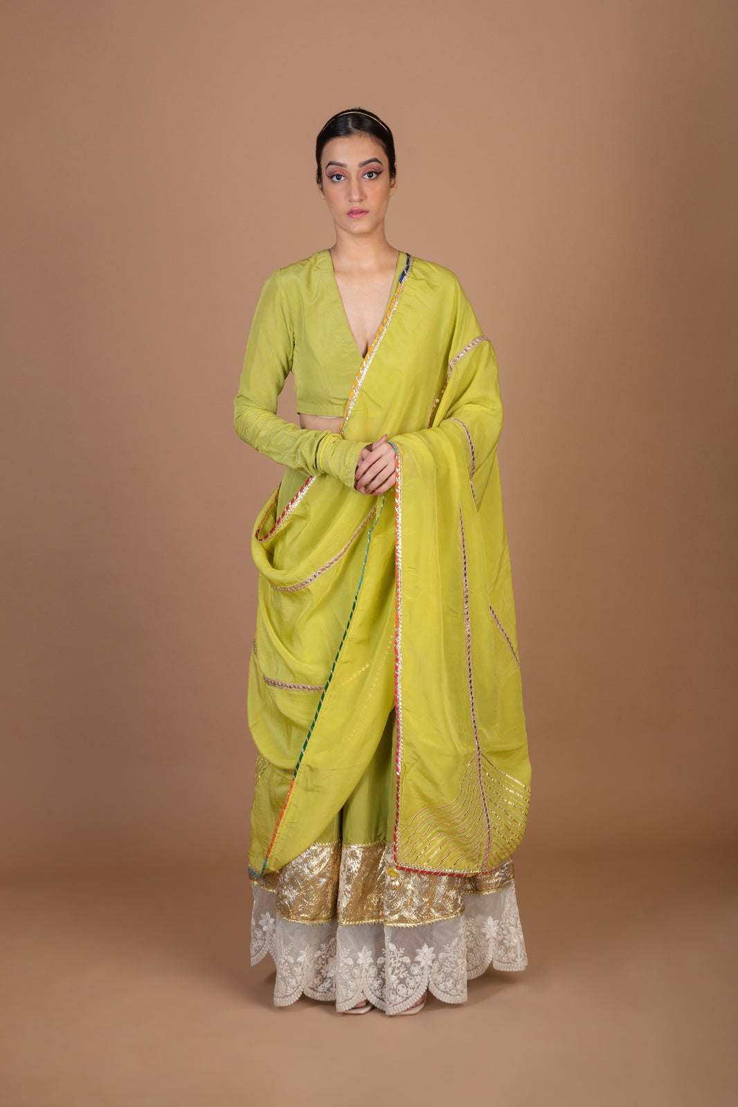 Description:Pear green scallop trimmed, floral embroidered lehenga with gota work. Paired with a blouse and gota lined dupatta.
