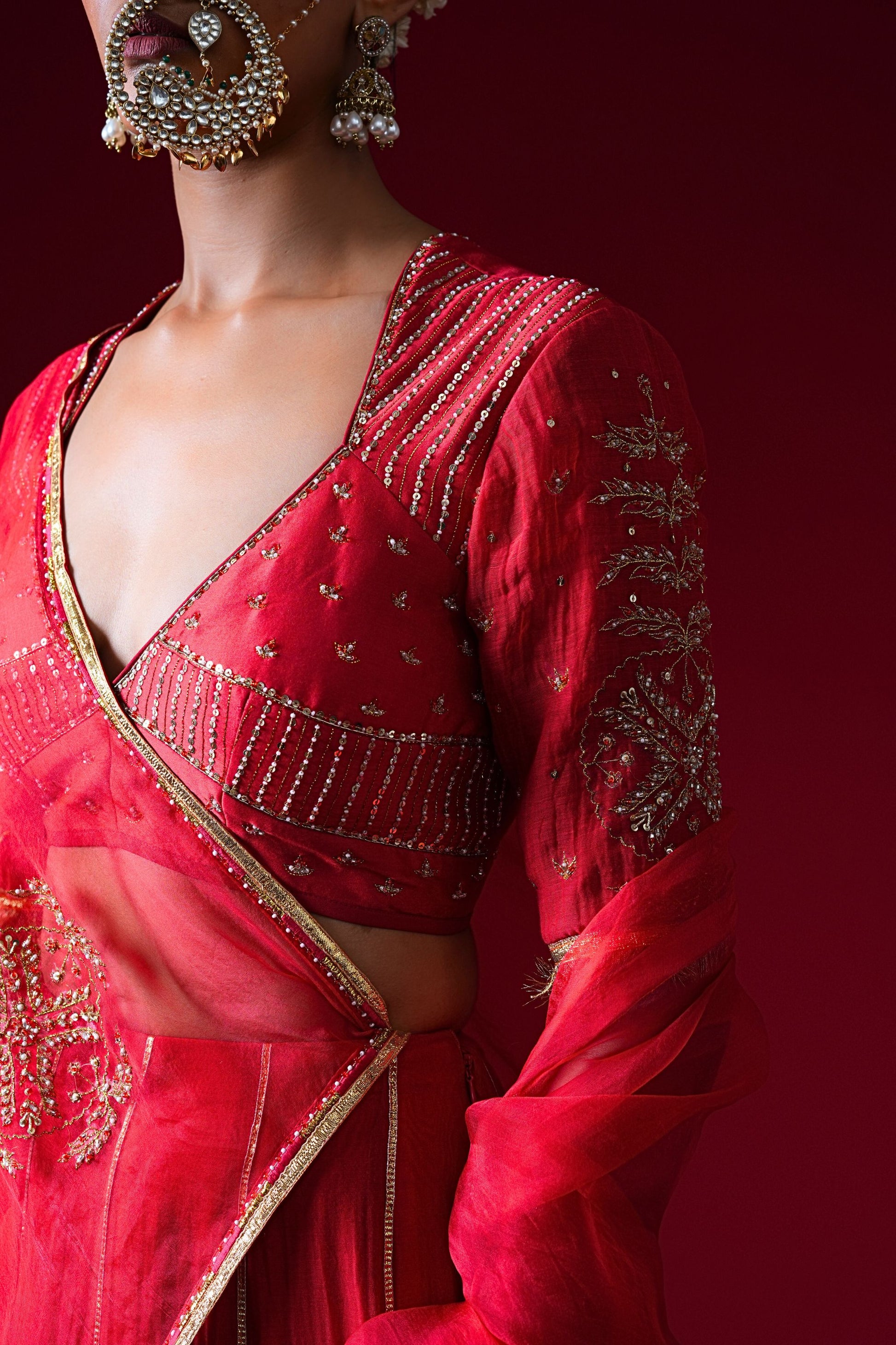 Description: Silk Chanderi Hand Embroidered Kalidaar Lehenga Set paired with Silk Organza Dupatta.