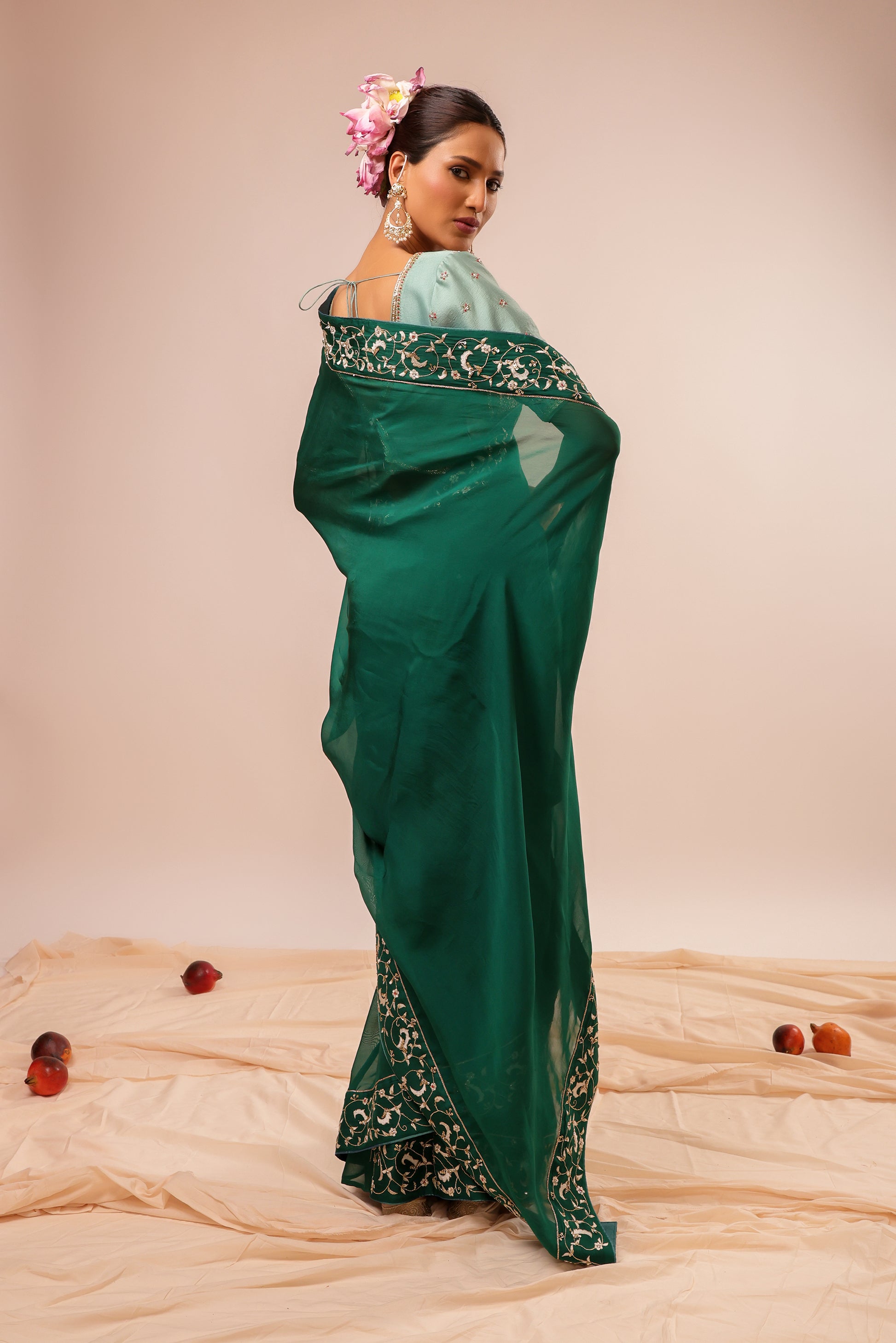 This exquisite organza saree features a delicate blend of hand and machine embroidery, paired elegantly with a pure silk Chanderi blouse adorned with intricate hand embroidery. Ideal for weddings, festive occasions, and trousseau collections, it offers a refined and graceful look that enhances your celebratory moments with timeless sophistication.