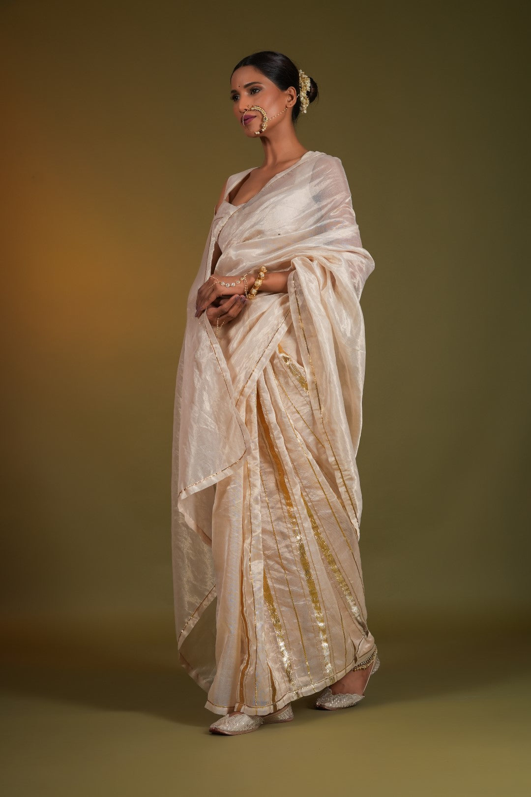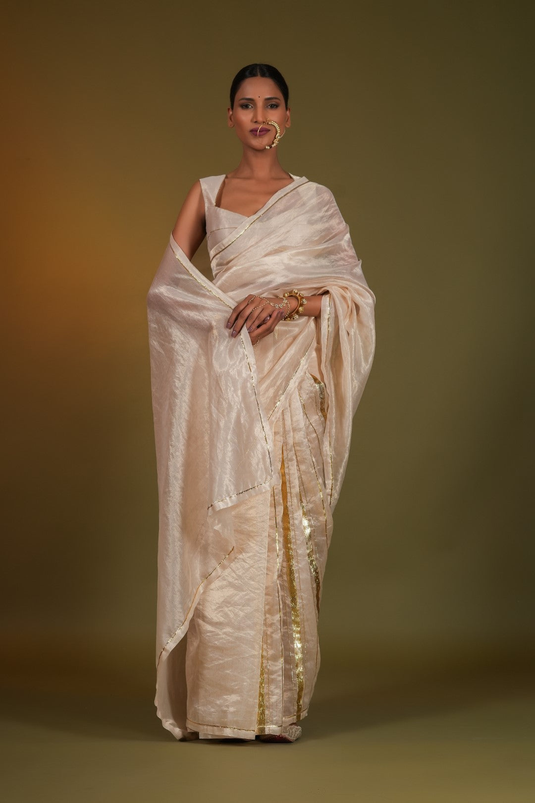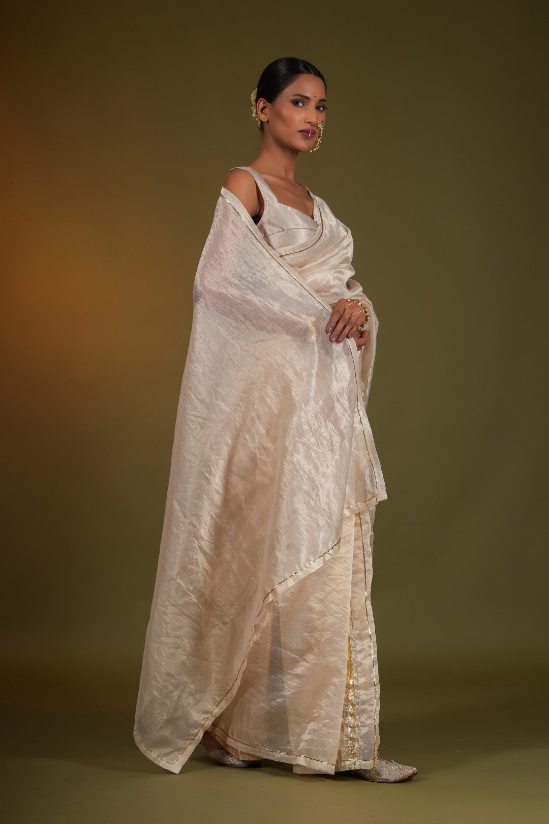 Nargis, a masterpiece of Indian textile artistry, is a beige gold saree that exudes elegance and sophistication. The intricate gota embroidery, reminiscent of the delicate patterns found in Ragamala miniature paintings, adds a touch of opulence to the ensemble. Crafted from the finest silk chanderi pure gold tissue, this saree is a testament to the skill and dedication of our master artisans.