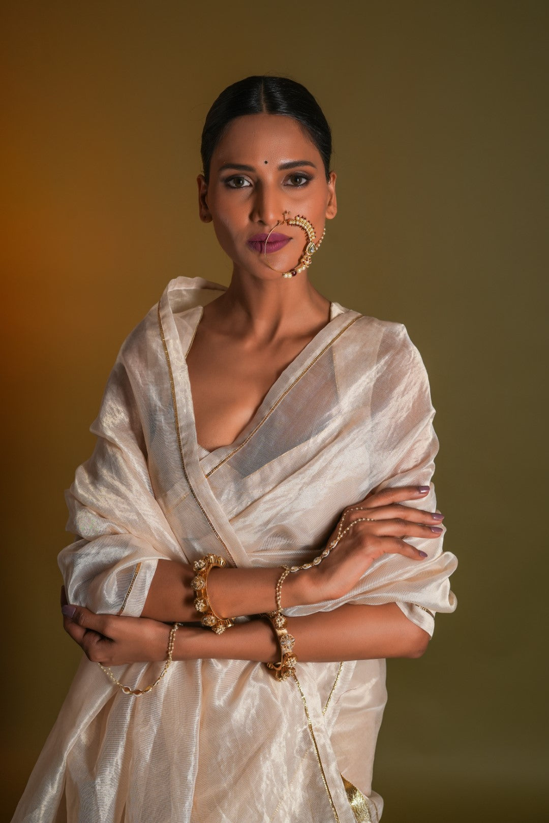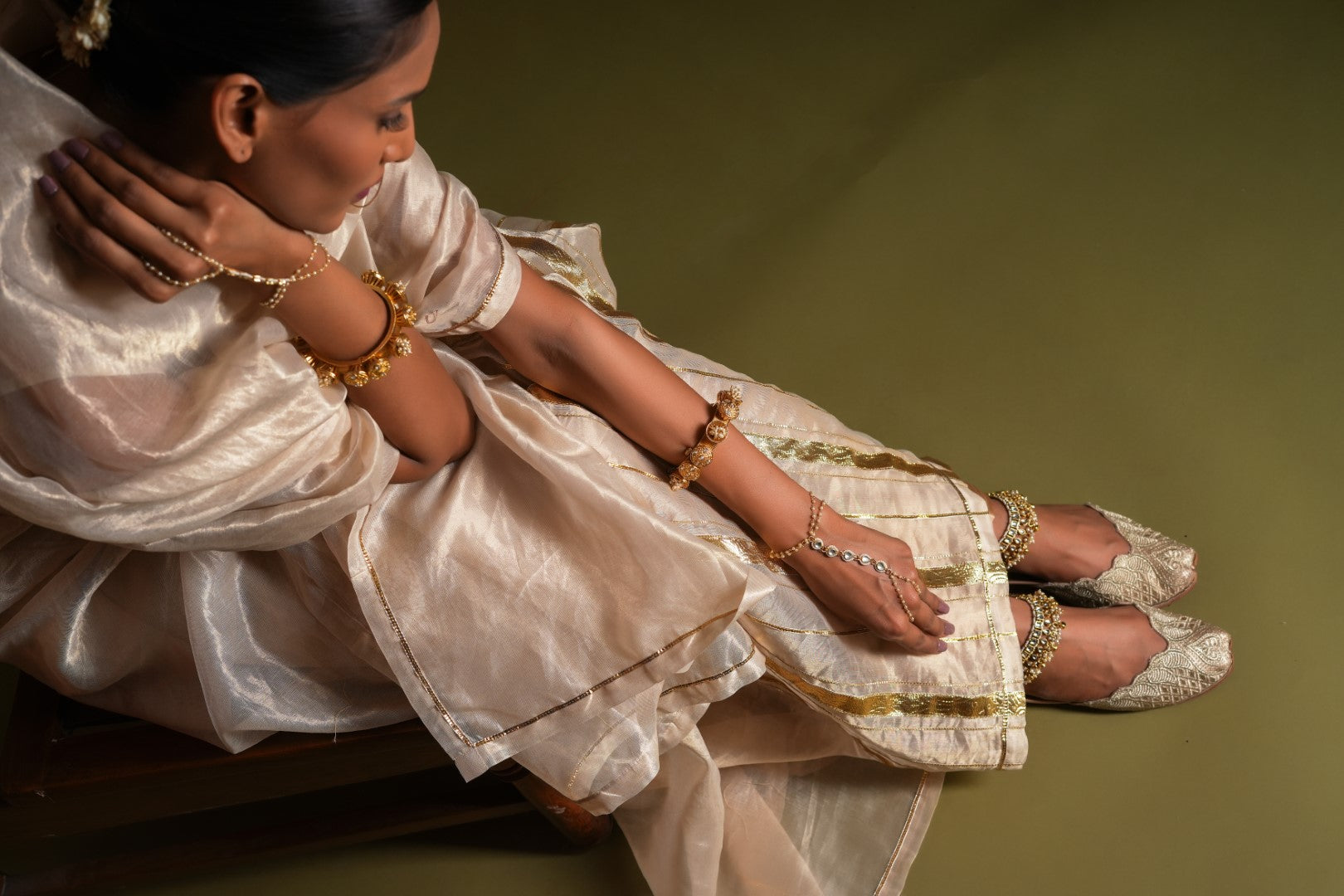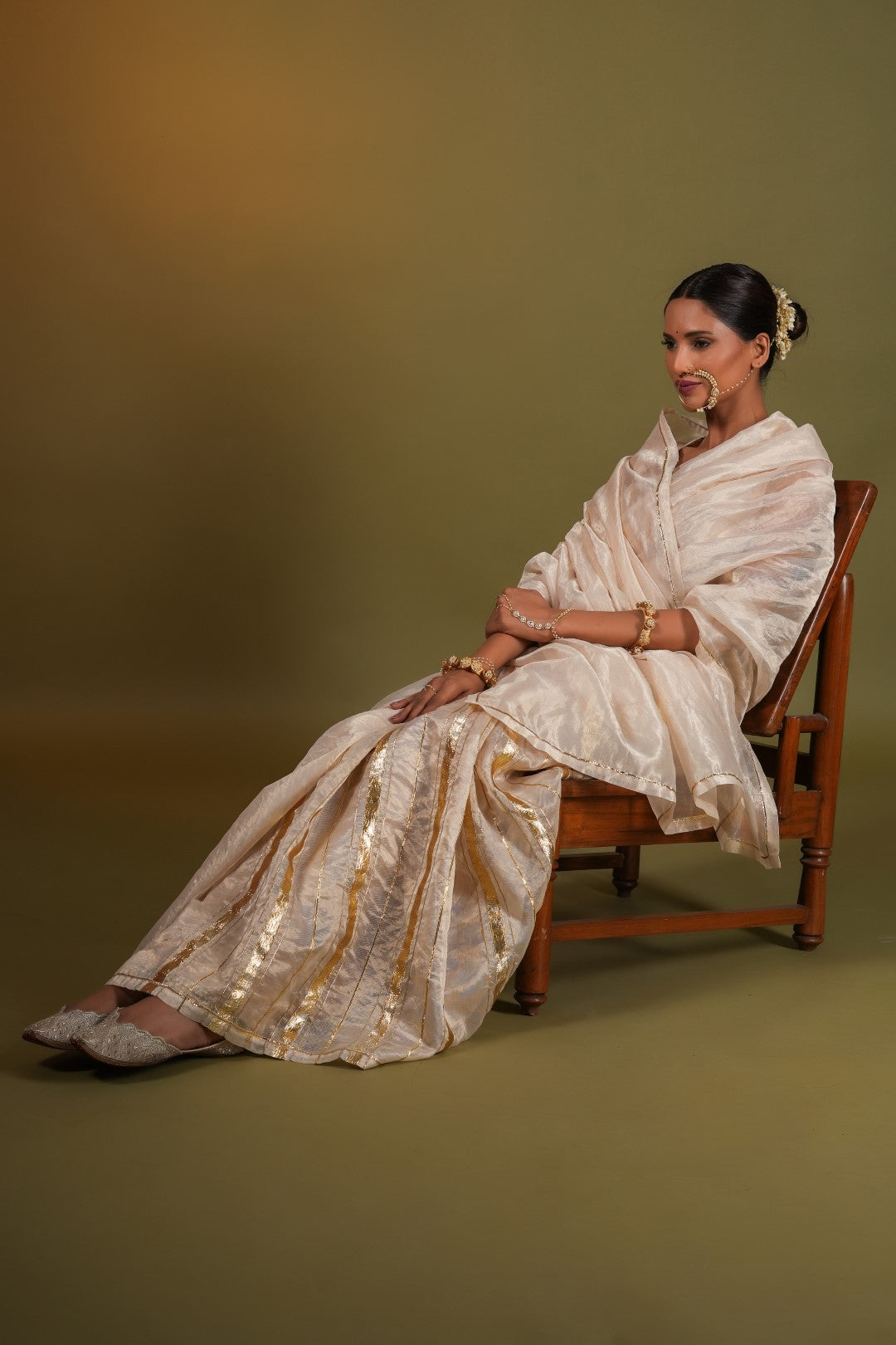Nargis, a masterpiece of Indian textile artistry, is a beige gold saree that exudes elegance and sophistication. The intricate gota embroidery, reminiscent of the delicate patterns found in Ragamala miniature paintings, adds a touch of opulence to the ensemble. Crafted from the finest silk chanderi pure gold tissue, this saree is a testament to the skill and dedication of our master artisans.