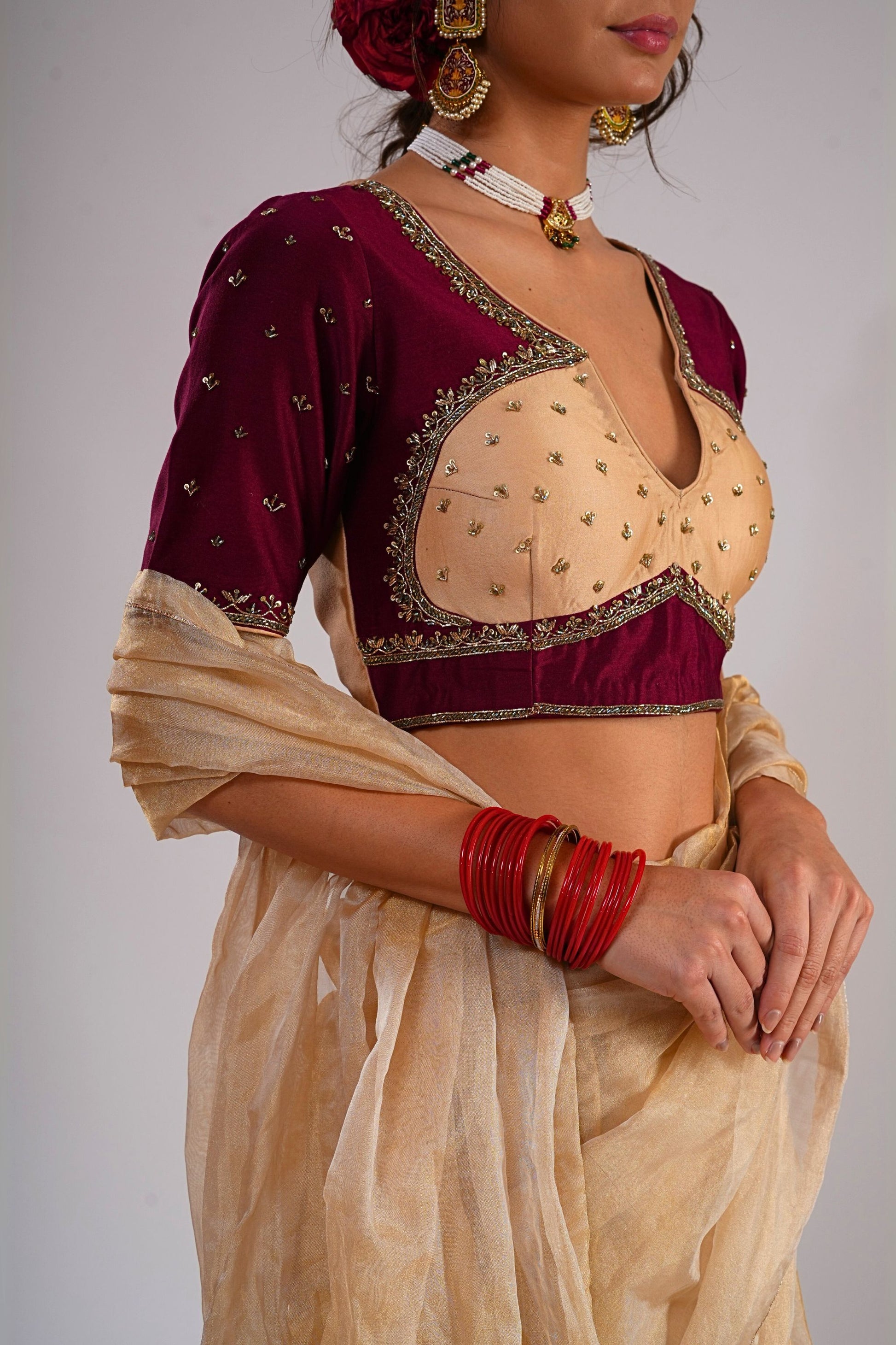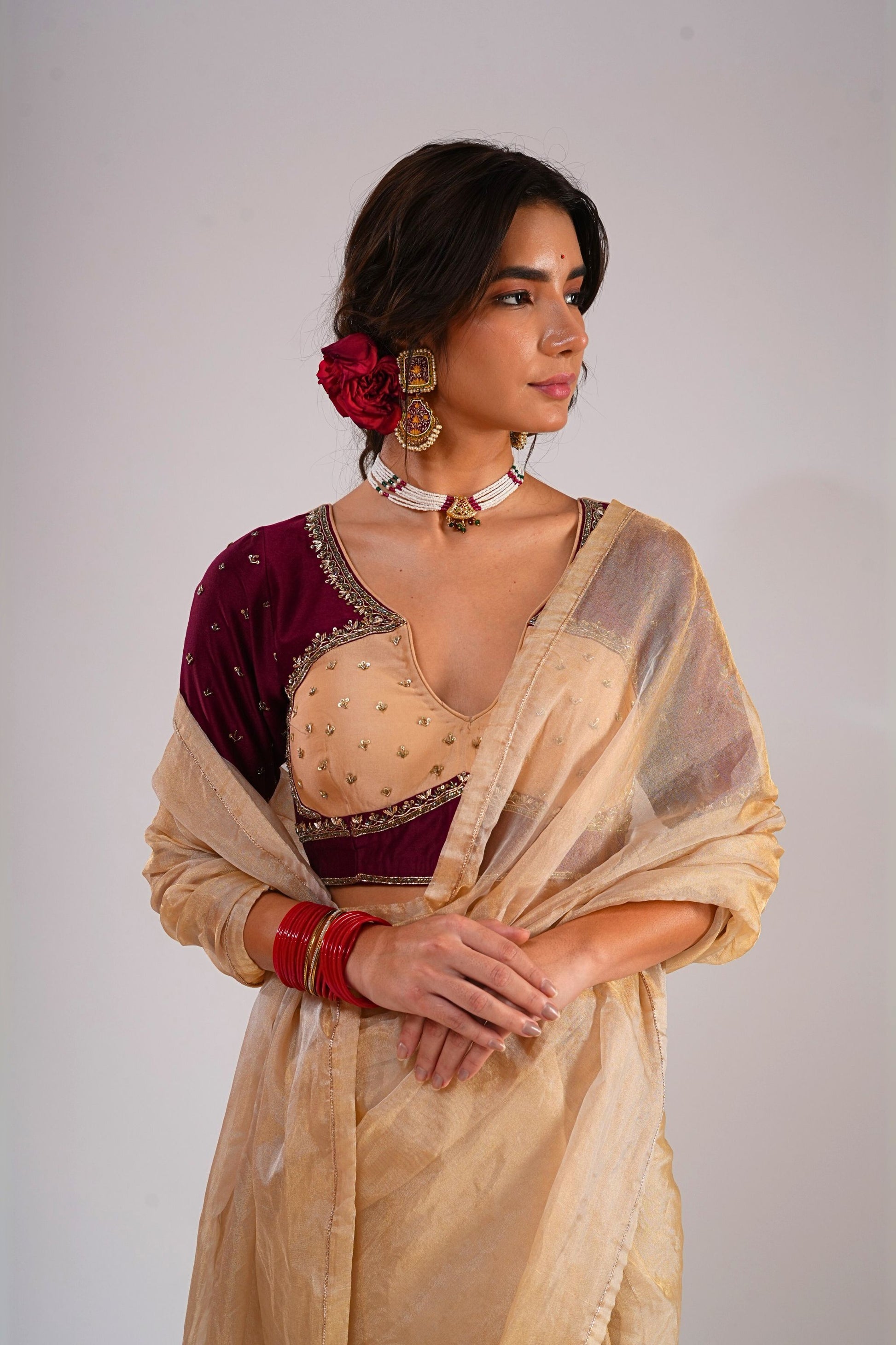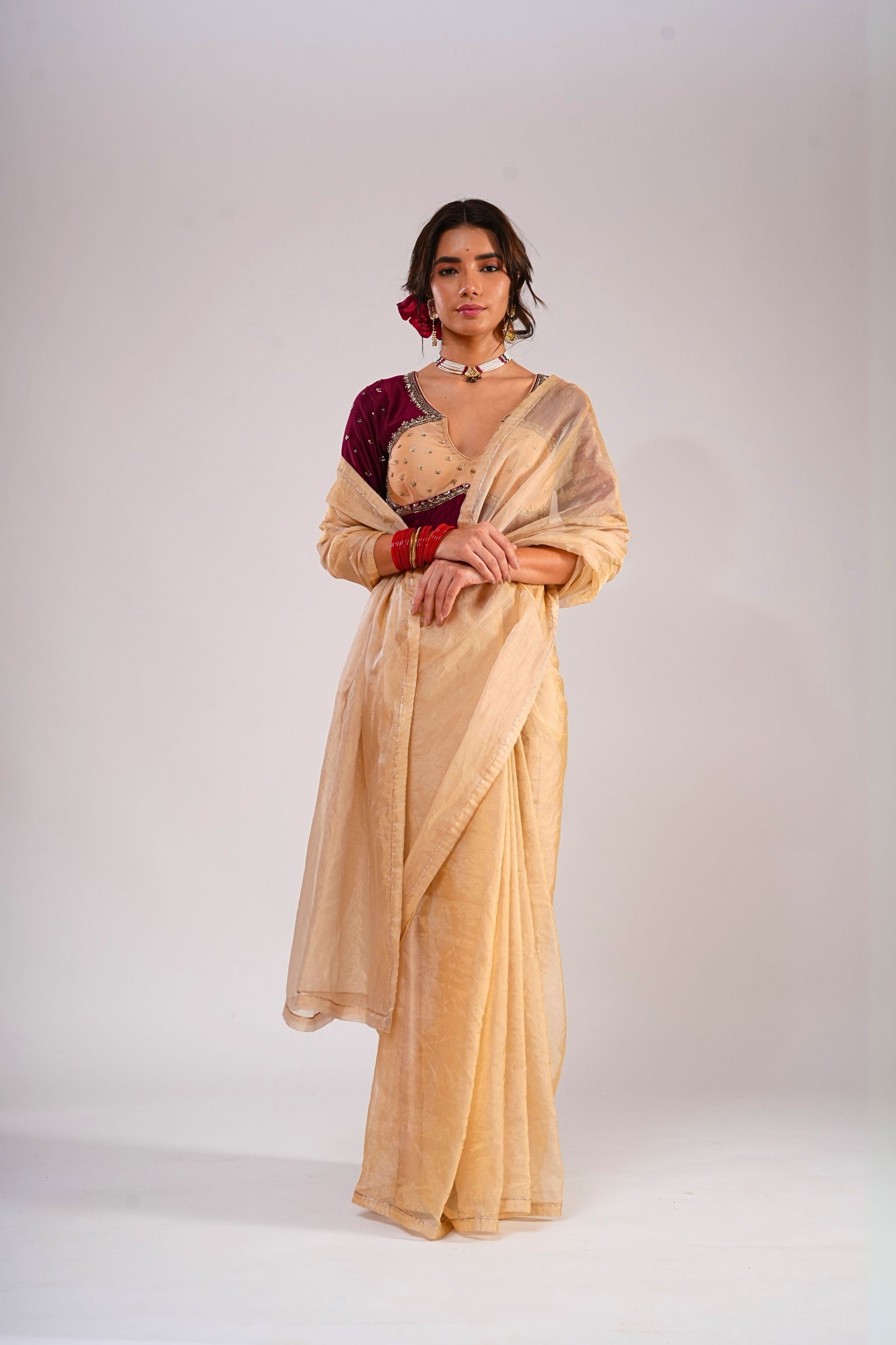 The Nazaakat Saree celebrates artistry with its luxurious gold silk organza tissue base, exuding a luminous sheen. It is styled with a double-toned blouse in rose peach and burgundy, hand-embroidered on pure silk Chanderi to create a refined contrast. The play of tones and textures in this ensemble reflects grace, tradition, and modernity in equal measure. A statement drape, it embodies festive grandeur with effortless sophistication.