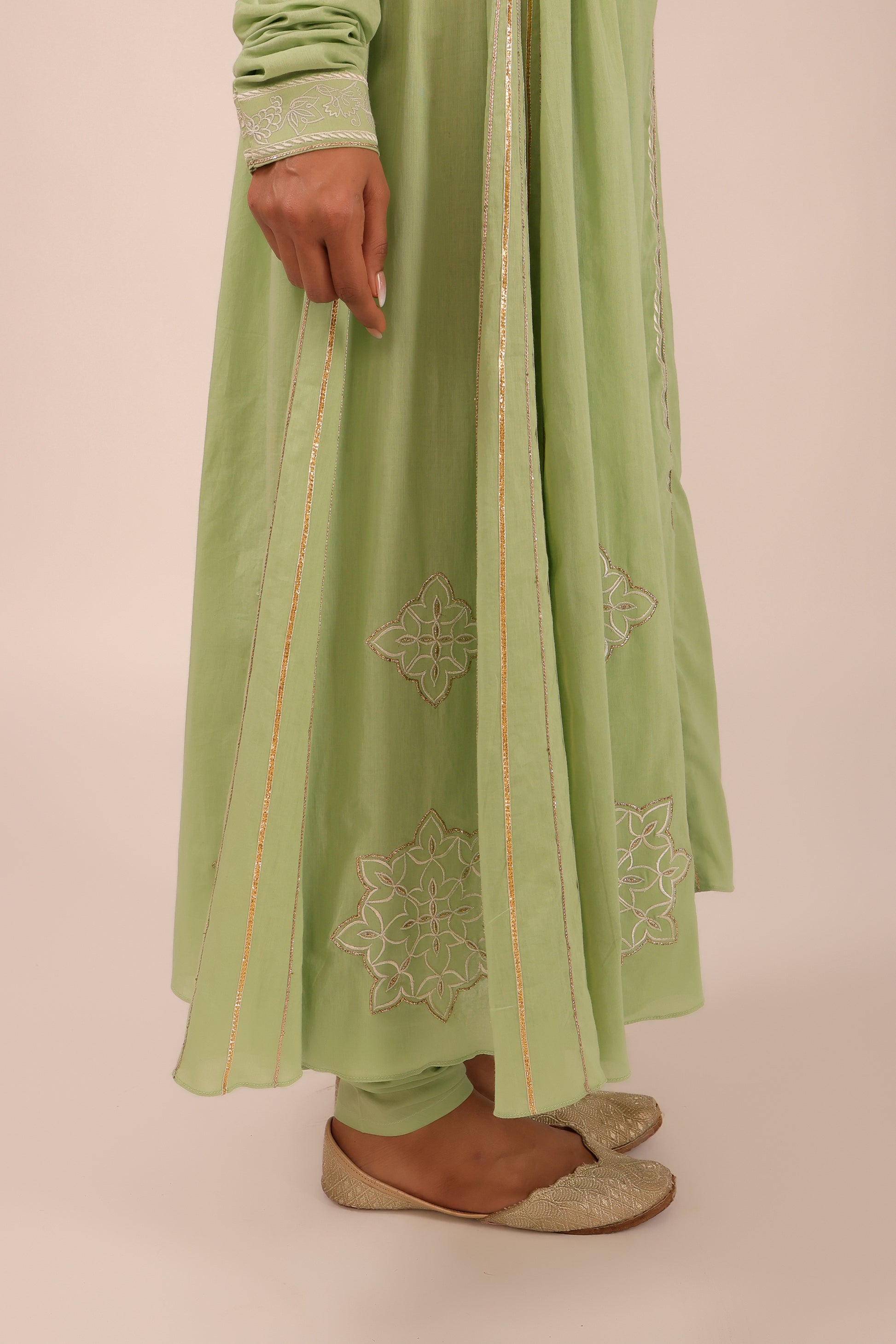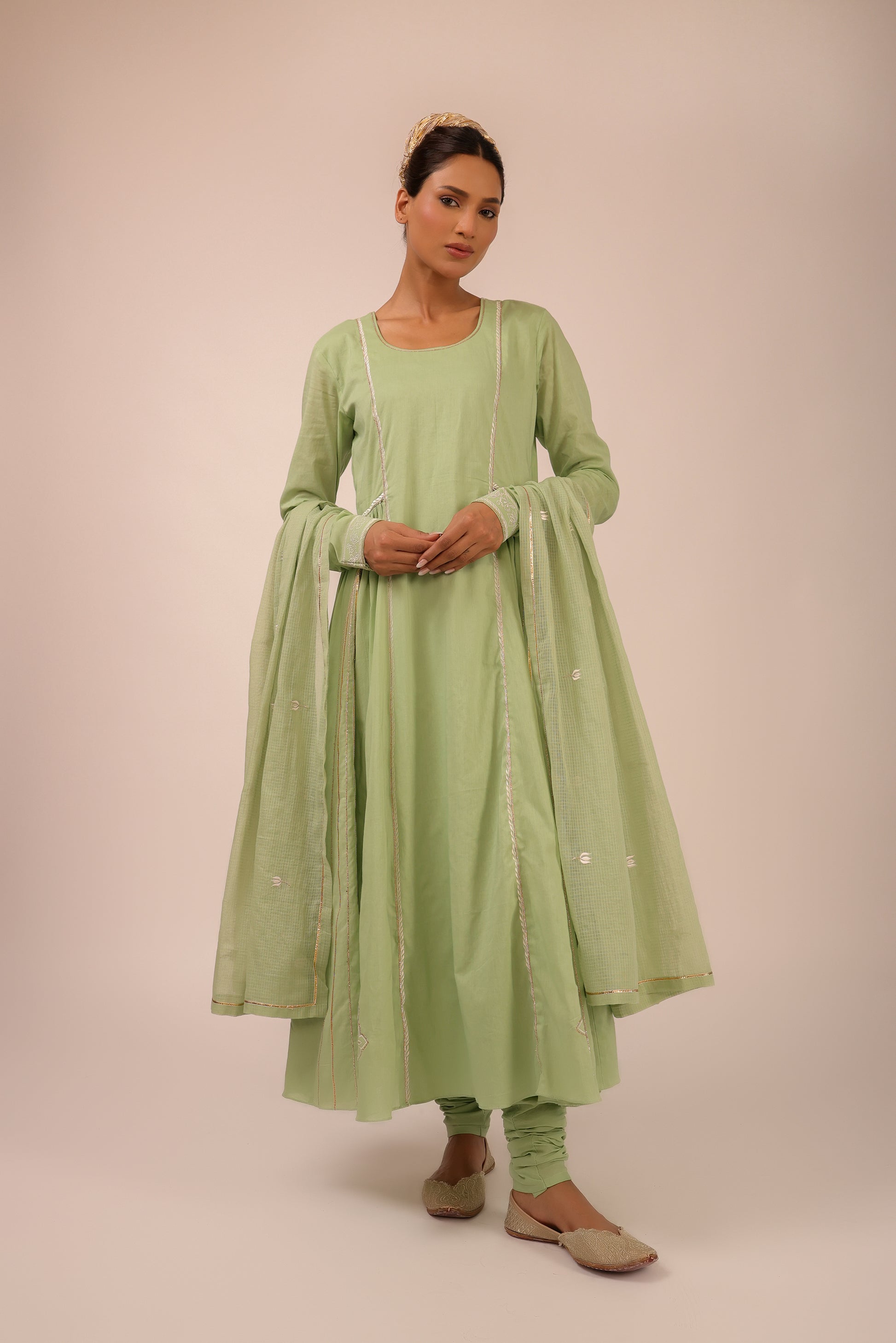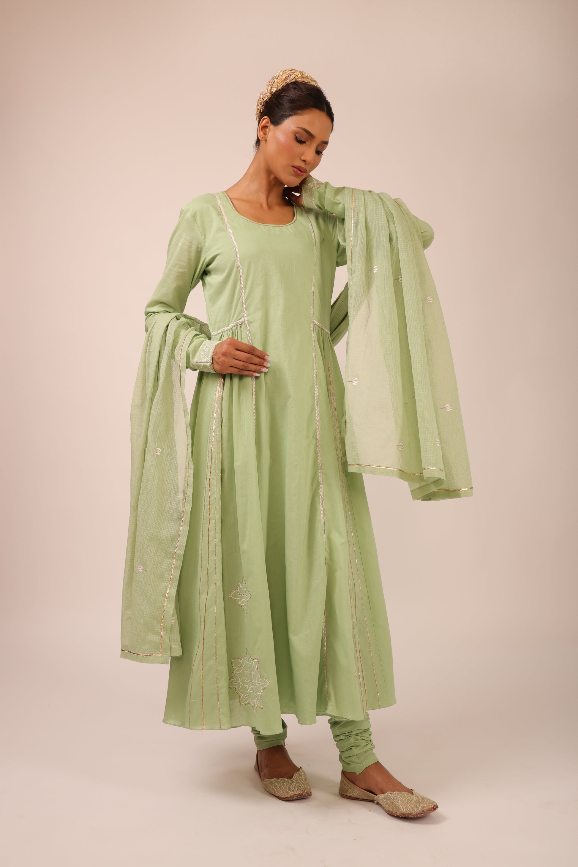 This Olive Green Embroidered Kalidaar Suit Set features pure cotton fabric for breathable comfort and elegant drape. The intricate embroidery enhances its traditional charm, while the accompanying churidaar ensures a perfect fit. Paired with a lightweight Kota Doriya cotton dupatta, this ensemble offers a refined blend of style and comfort, ideal for festive occasions and casual wear alike.