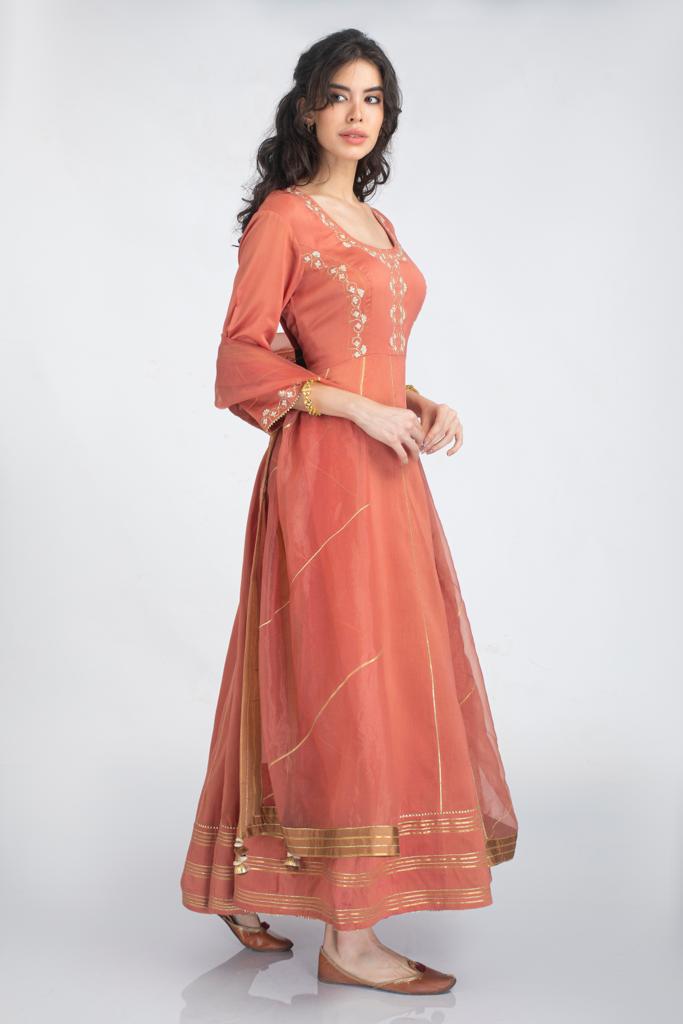 Description: Silk chanderi anarkali kurta, front resham zari work and gota on the hem paired with organza dupatta with gota work and tassels.