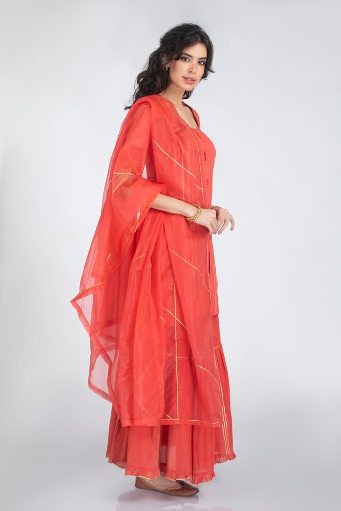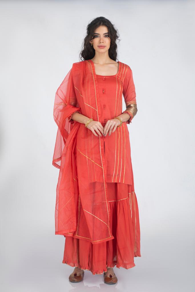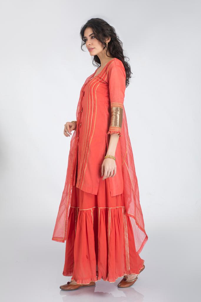 Description: Silk chanderi thigh length straight cut kurta, front potli buttons and gota work paired with cotton gharara style skirt and organza dupatta.