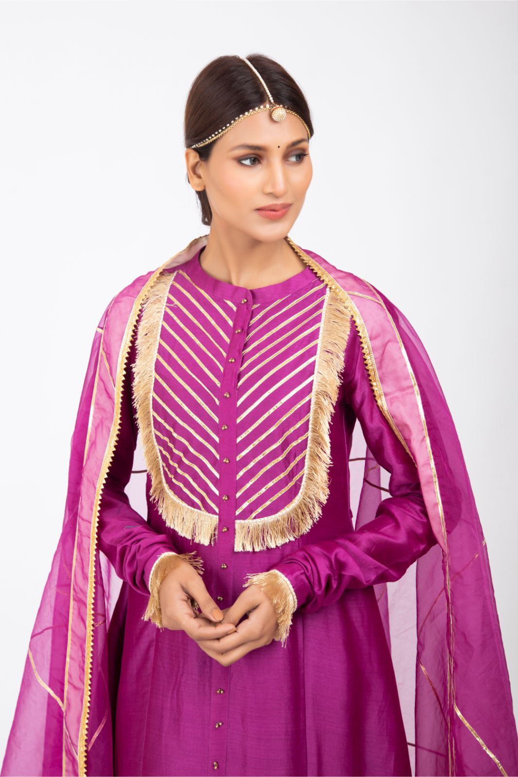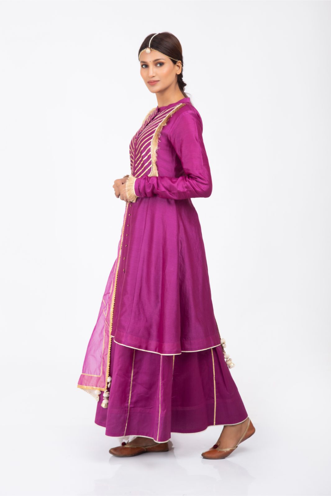 Description: Front yoke kalidaar kurta with gota emb on it paired with skirt and organza dupatta