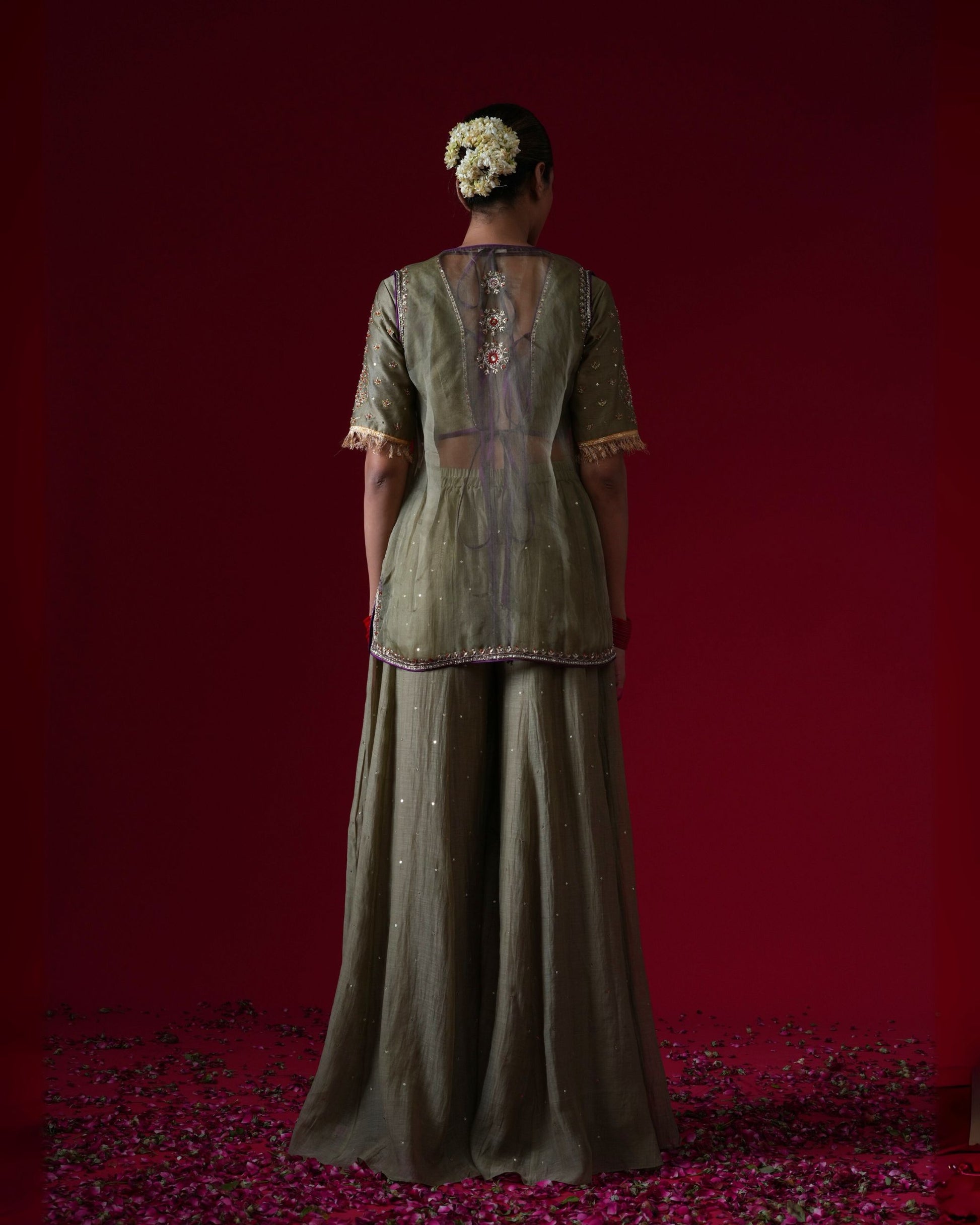 Description: Silk Chanderi Hand Embroidered Sharara Set paired with Hand Embroidered Silk Chanderi blouse and Silk Organza Short Jacket and Dupatta.